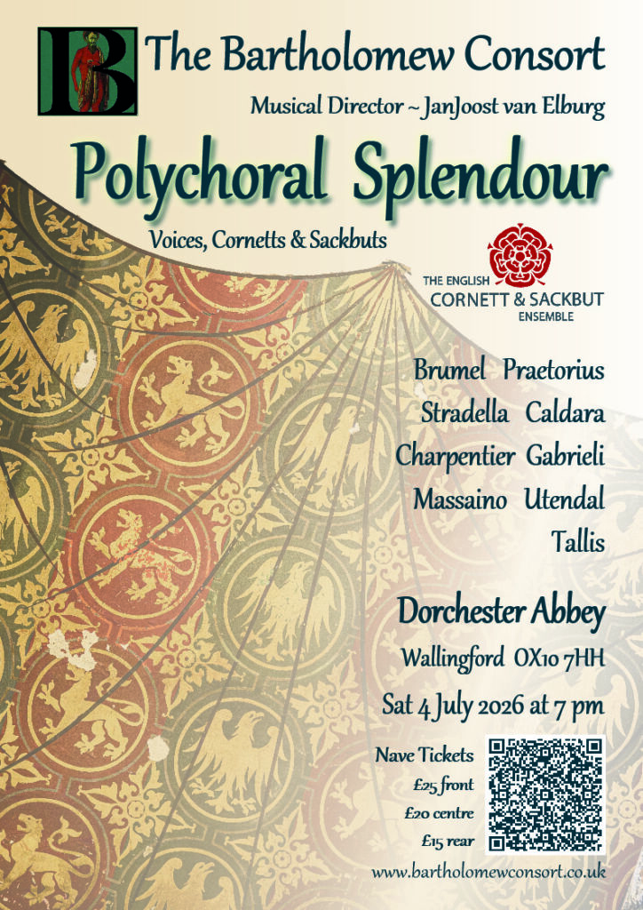 The Bartholomew Consort is marking 25 years of singing some 75 concerts with Dutch conductor, JanJoost van Elburg, by coming together in Dorchester Abbey with the English Cornett & Sackbut Ensemble to present this fitting programme of Polychoral Splendour.